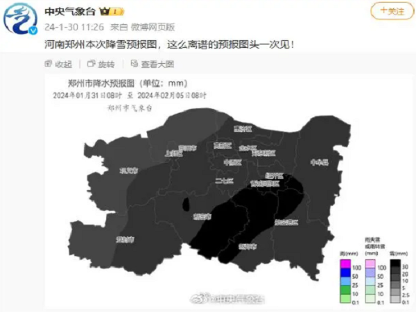 1月30日,@中央氣象臺 發布河南鄭州本次降雪預報圖,稱“這么離譜的預報圖頭一次見”。