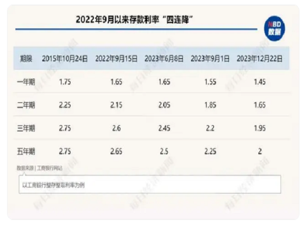 在2023年12月22日,包括工商銀行、農業銀行、中國銀行、建設銀行、交通銀行等國有銀行,以及部分股份行如招商銀行等均對存款掛牌利率進行了下調。下調后,上述銀行的整存整取三年期掛牌利率,均已告別“2時代”,降至1.95%。