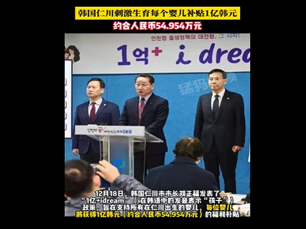金融界12月19日消息 據韓國《亞洲經濟》,18日仁川市市長劉正福發表了"1億+idream"(i在韓語中的發音表示“孩子”)政策,旨在支持所有在仁川出生的嬰兒,每位嬰兒將獲得1億韓元(約合人民幣54.954萬元)的福利補貼。