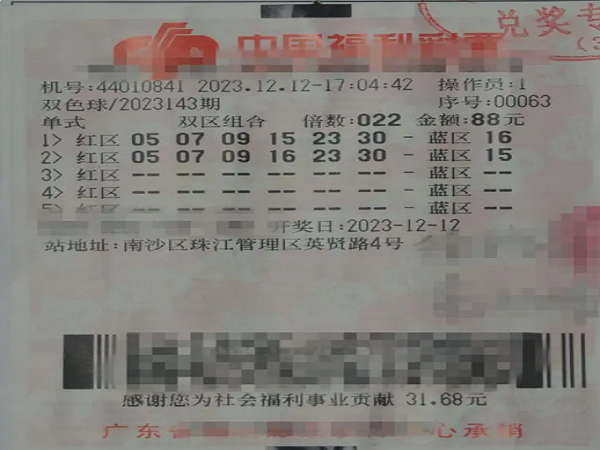 12月12日,福彩雙色球第2023143期開獎,廣州南沙一站點售出的一張2注號碼22倍投注的88元彩票,中出22注656萬多元一等獎特別獎,總獎金高達1.44億多元,這是廣州繼2013年后再次爆出億元巨獎,同時創下廣州彩市單人中獎最高紀錄。
