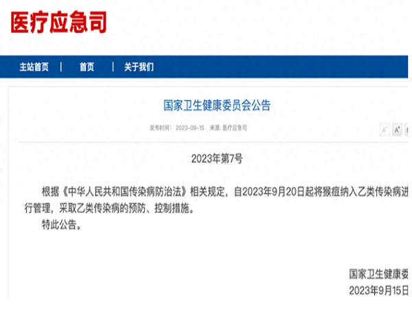 據國家衛健委公告,自2023年9月20日起將猴痘納入乙類傳染病進行管理。中疾控9月8日發布的檢測情況顯示,中國內地(不含港澳臺)8月新增報告501例猴痘確診病例,其中,首次報告5例女性病例。