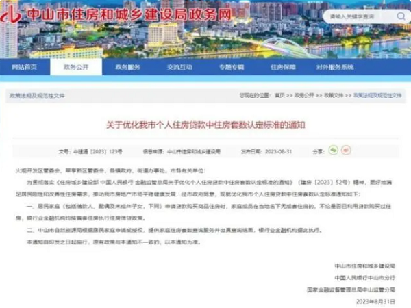 據中山市住房和城鄉建設局政務網,8月31日,廣東省中山市住房和城鄉建設局發布《關于優化我市個人住房貸款中住房套數認定標準的通知》,宣布認房不認貸。本通知自印發之日起施行,原有政策與本通知不一致的,以本通知為準。