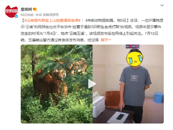 近日,一位IP屬地顯示“云南”的網民在社交平臺發布“撿菌子遇到3只野生老虎打架”的視頻。視頻中顯示事件發生的時間為“7月4日”,地點“云南玉溪”,該視頻發布后在網絡上引起關注。