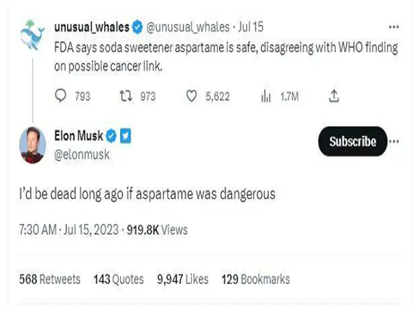 馬斯克:如果阿斯巴甜致癌,我早就死了