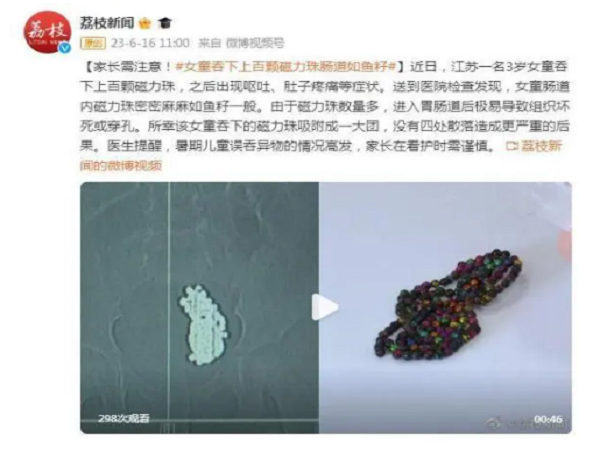 近日,江蘇一名3歲女童吞下上百顆磁力珠,之后出現嘔吐、肚子疼痛等癥狀。送到醫院檢查發現,女童腸道內磁力珠密密麻麻如魚籽一般。