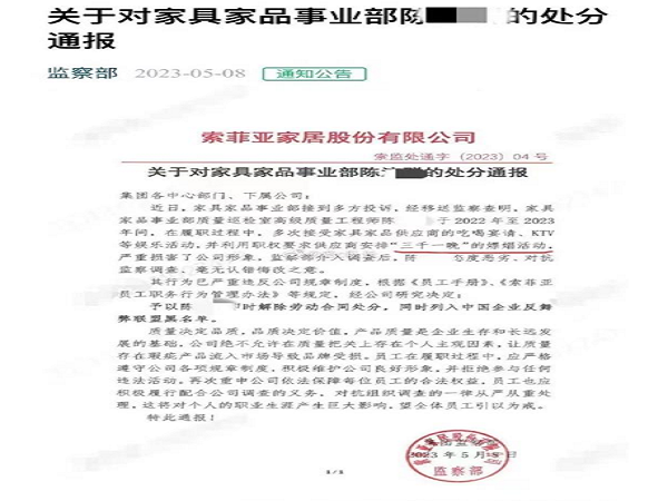 近日,上市家居公司索菲亞一則處分通報引發關注,通報稱該司一高級工程師多次接受供應商吃喝宴請等,并利用職權要求供應商安排“三千一晚”的嫖娼活動,被解除勞動合同。