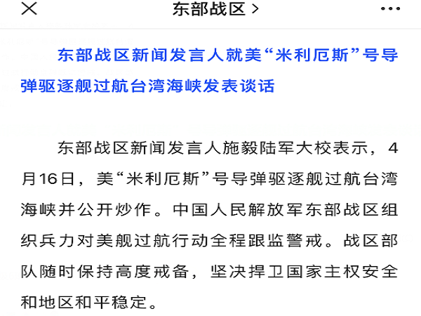 據東部戰區公眾號消息 東部戰區新聞發言人就美“米利厄斯”號導彈驅逐艦過航臺灣海峽發表談話。