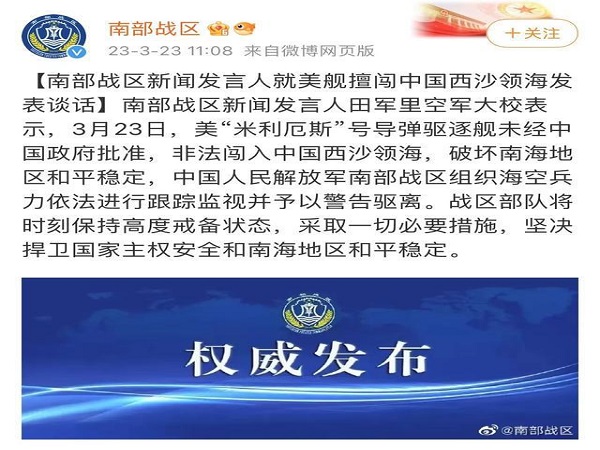 據中國人民解放軍南部戰區官方微博消息,南部戰區新聞發言人田軍里空軍大校表示,3月23日,美“米利厄斯”號導彈驅逐艦未經中國政府批準,非法闖入中國西沙領海,破壞南海地區和平穩定,中國人民解放軍南部戰區組織海空兵力依法進行跟蹤監視并予以警告驅離。