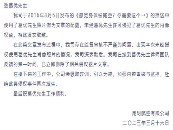 因7年前未經授權用葛優照片做文章“感覺身體被掏空”配圖,昆明航空3月16日向葛優公開致歉。