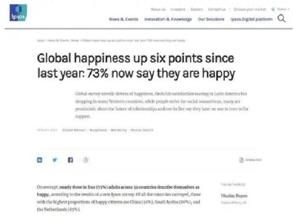 中新網3月20日電 近日,國際知名民調機構益普索集團(Ipsos)發布了一份有關全球幸福指數的調查報告,結果顯示,在32個國家中,幸福感指數最高的國家是中國(91%),其后是沙特阿拉伯(86%)和荷蘭(85%)。