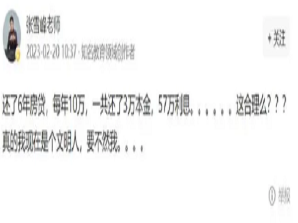 2月20日,升學規劃名師張雪峰在社交平臺個人主頁吐槽稱“6年還60萬房貸,利息57萬”引發網友熱議和普遍關注。