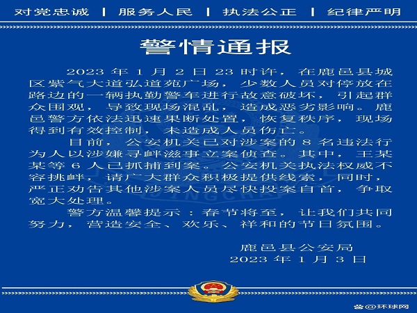 2023年1月2日23時許,在鹿邑縣城區紫氣大道弘道苑廣場,少數人員對停放在路邊的一輛執勤警車進行故意破壞,引起群眾圍觀,導致現場混亂,造成惡劣影響。
