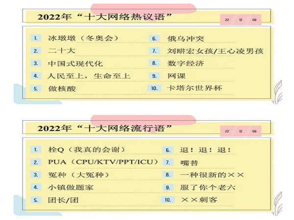 12月8日,由《語言文字周報》主辦的2022年“十大網絡流行語”“十大網絡熱議語”公布結果。