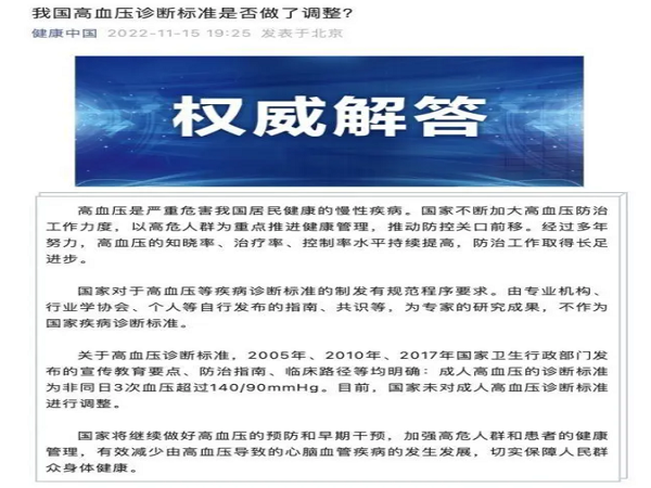 國家衛健委:未對成人高血壓診斷標準進行調整