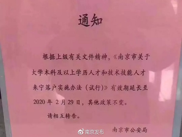 根據工作安排,《南京市關于大學本科及以上學歷人才和技術技能人才來寧落戶實施辦法(試行)》有效期延長至2020年2月29日,其他不變。
