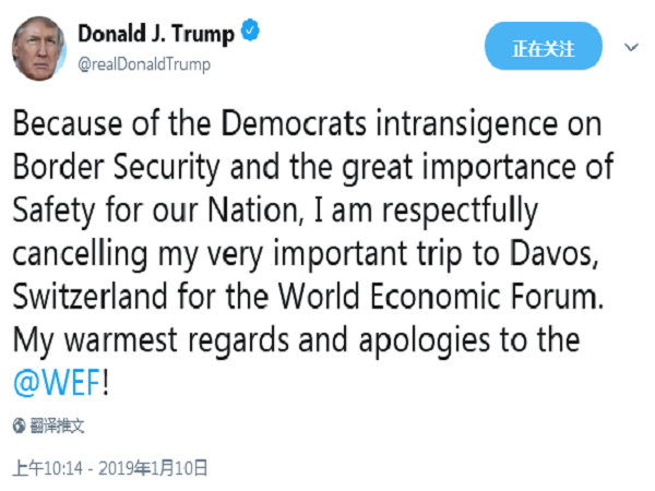 【環球網報道記者 趙建東】美國政府部分“關門危機”仍在持續。當地時間10日,美國總統特朗普發推,宣布取消參加瑞士達沃斯世界經濟論壇年會。