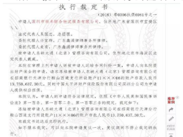 2018年10月,因運輸合同糾紛,順豐向廣東省深圳市寶安區人民法院提出財產保全申請,請求凍結被東峽大通(北京)管理咨詢有限公司(ofo的運營主體,下文簡稱‘東峽大通’)在招商銀行天津分行鞍山西道支行所設賬戶存款1300萬元人民幣。