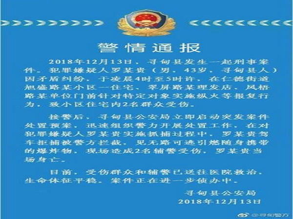 犯罪嫌疑人羅某貴(男,43歲,尋甸縣人)因矛盾糾紛,于凌晨4時至5時許,在仁德街道旭盛路某小區一住宅、翠屏路某理發店、鳳梧路某單位門前針對特定對象實施縱火等報復行為,致小區住宅內2名群眾受傷。