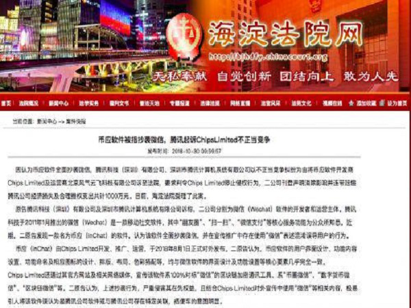 因認為幣應軟件全面抄襲微信,騰訊科技(深圳)有限公司、深圳市騰訊計算機系統有限公司以不正當競爭糾紛為由將幣應軟件開發商Chips Limited及運營商北京風氣云飛科技有限公司訴至法院,要求判令Chips Limited停止侵權行為,二公司刊登聲明消除影響并連帶賠償騰訊公司經濟損失及合理維權支出共計1000萬元。