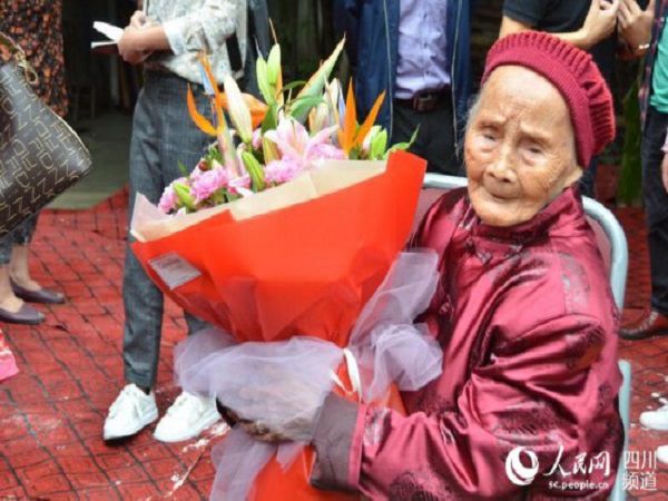成都市雙流區勝利鎮云華社區,朱鄭氏老人在小院里休息。9月11日,農歷八月初二,她迎來自己118歲生日,子子孫孫們都回來為老壽星祝壽。