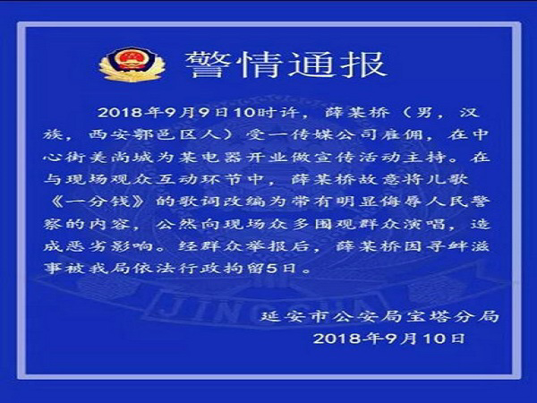 在與現場觀眾互動環節中,薛某橋故意將兒歌《一分錢》的歌詞改編為帶有明顯侮辱人民警察的內容,公然向現場眾多圍觀群眾演唱,造成惡劣影響。