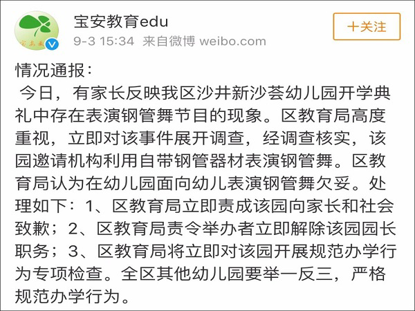9月3日是深圳中小學幼兒園開學第一天。有學生家長反映,深圳寶安區沙井新沙薈幼兒園在開學典禮上表演鋼管舞。