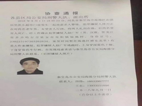 河北秦皇島市公安局官方微博@秦皇島公安網絡發言人 2日發布警情通報稱,2018年9月1日18時30分許,海港區某市場超市發生一起惡性案件,犯罪嫌疑人趙某某(男,45歲,黑龍江人)作案后潛逃。