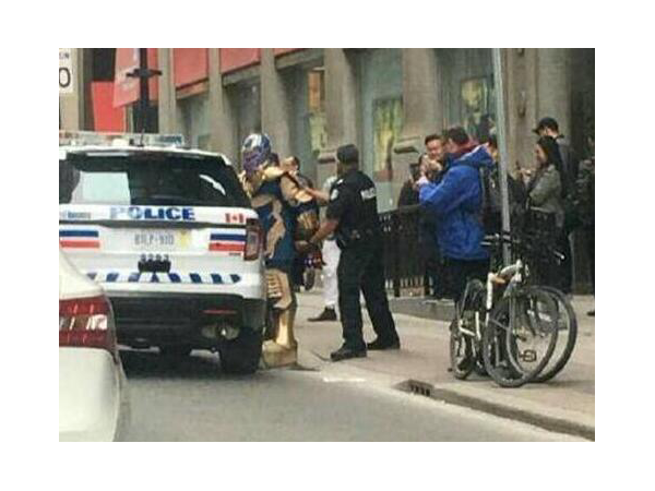最近,一張“滅霸被捕”的照片在社交網絡上走紅。有人稱“在多倫多有人扮滅霸鬧事被捕 ”調侃稱“恭喜多倫多警察喜提滅霸一只”,也有人認為這是《復仇者聯盟4》大結局提前泄露了。然而事實的真相是,這是漫威粉絲在多倫多即興拍出來的照片。