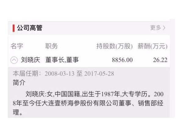 2016年,當不少同齡人還在為生活奔忙時候,時年29歲的劉曉慶(注:不是那個家喻戶曉的明星劉曉慶)就已經以8億身家成為上市公司壹橋海參(現更名為晨鑫科技)的董事長,也是當時A股市場上最年輕的女董事長。