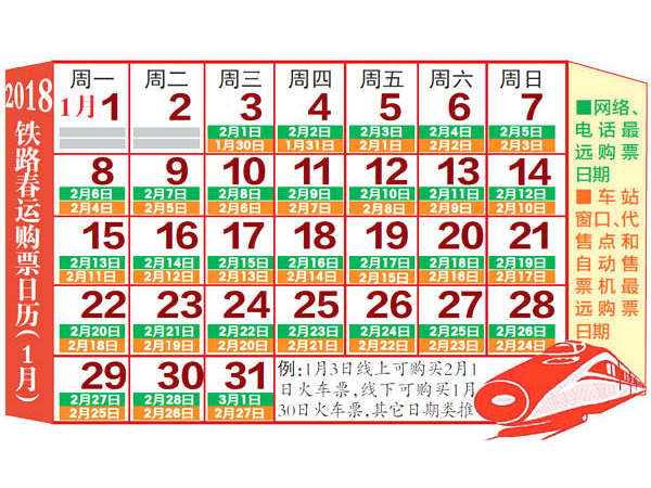 2018年春運火車票即將正式開售,1月3日,互聯網、手機APP和電話(95105105)便可搶購2月1日(春運首日)各次列車的火車票了。1日,記者從新疆鐵路部門了解到,2018年春運從2月1日開始,至3月12日結束,共計40天。 目前,互聯網、手機、電話等線上渠道的預售期為30天,車站、代售點及自助售票機線下渠道的預售期為28天。按此預售期,2月1日(春運首日)的