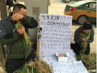 2017年11月5日,河北三河市愛民路出現了心酸一幕,一男一女跪在地上,兩人中間一張白紙上寫著:“吃草表演,自愿打賞,我們夫妻來自湖南,孩子目前燕達醫院治病,已進行了移植,可出現了肺部感染,肺部排異,現無錢繼續治病,請各位伸出援手救救9歲兒子”,白紙上同時還粘貼著2張小男孩在醫院治療的照片,一個小紙盒里裝著幾張面額不等的紙幣,地上擺著很多住院資料和雜草,男子和女子則
