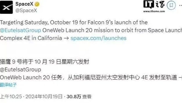 SpaceX今天將進行今年第100次軌道發射任務,為競爭對手OneWeb發射20顆衛星