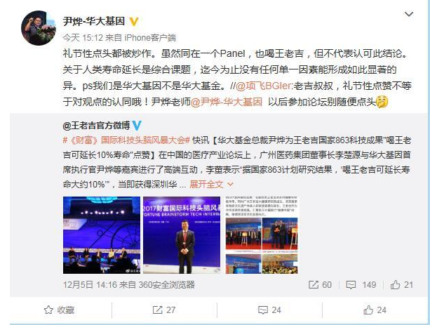 在近日舉辦的《財富》全球論壇上,廣藥集團董事長李楚源表示:“國家863計劃研究結果表明,喝王老吉可延長壽命大約10%。”華大基因CEO尹燁在社交媒體上表示,關于人類壽命延長是綜合課題,迄今為止沒有任何單一因素能形成如此顯著的異。
