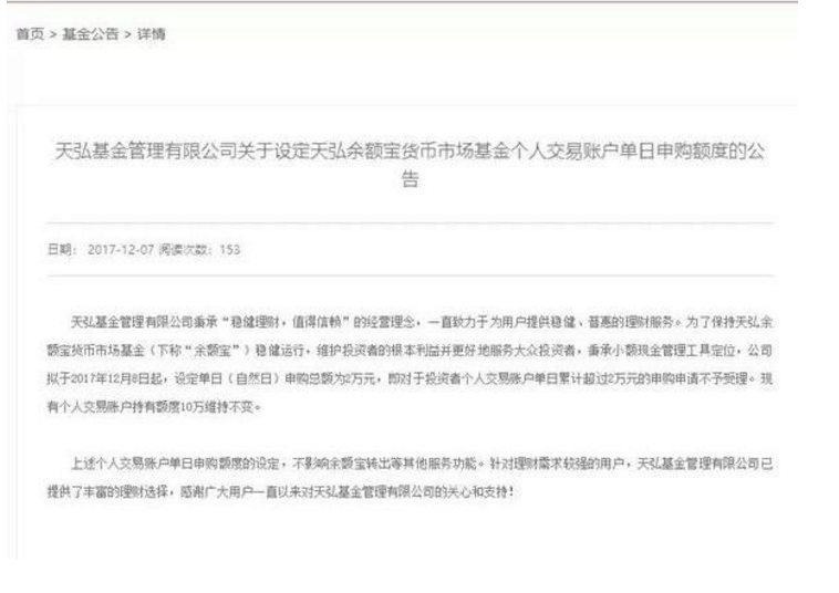 天弘基金12月7日晚間宣布,將余額寶單日(自然日)申購額度調為2萬元,即對于投資者個人交易賬戶單日累計超過2萬元的申購申請將不予受理。該措施將于12月8日零時起實施。
