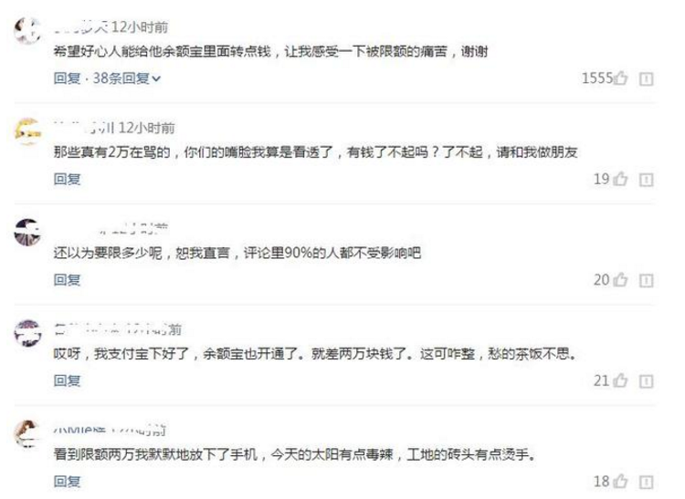 官方公布消息后,吃瓜網友們的評論,絕大部分人跟小編的一樣。有些甚至發出了類似“希望好心人能給他余額寶里面轉點錢,讓我感受一下被限額的痛苦,謝謝”的這種美好愿望。