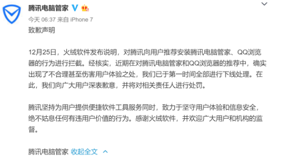 以下為騰訊電腦管家致歉聲明: