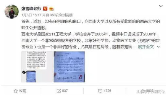 視頻中,考研名師張雪峰疑似在演講中號召大家不要報考西南大學 ,并調侃西南大學的獸醫專業。隨后,多名西南大學的學生在微博發文,要求張雪峰道歉,西南大學校方表示,已知悉此事。
