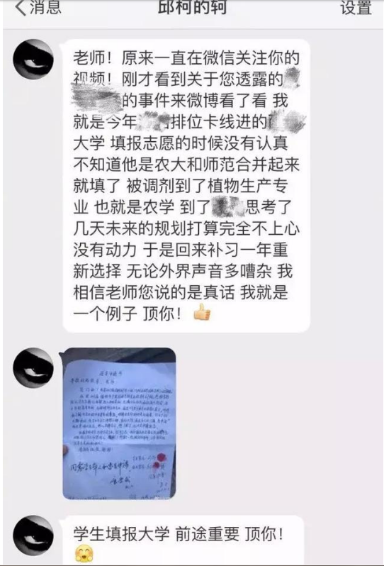 最后附上兩張圖片,這是風波過后一位同學發給我的私信,他是今年從某高校退學的同學,因為報考卡位進線,而被調劑到的了自己不喜歡的專業,最后經過了解確定不是自己未來想有的發展方向,而退學復讀。很多人不知道卡位進線的后果,西南大學,絕對是個好大學,絕對值得報考,動物醫學專業也就是我視頻中說的獸醫也絕對是個好專業,絕對值得報考,但我要強調的不是一個學校或者一個專業好不好,我要強調的是,在高考志愿填報中,如果你本身就是在所謂的沖一個學校,一定要考慮到這個學校有沒有你無法接受的專業,如果這個學校有你無法接受的專業,你就不要去報考。因為很有可能你上的就是你無法接受的專業!我在說明這個問題的時候舉了一個有的人認為不恰當的例子。僅此而已。