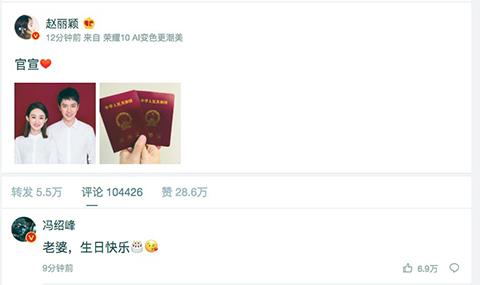 馮紹峰趙麗穎領證結婚 男方表示希望大家多多祝福