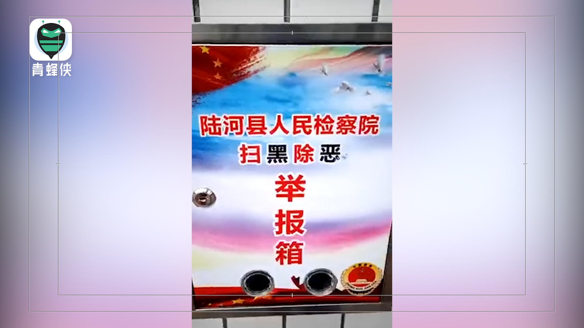 視頻顯示,一個箱體看起來較為嶄新,外部貼著“陸河縣人民檢察院掃黑除惡舉報箱”海報字樣的舉報箱表面并無遞信口、且不能打開。