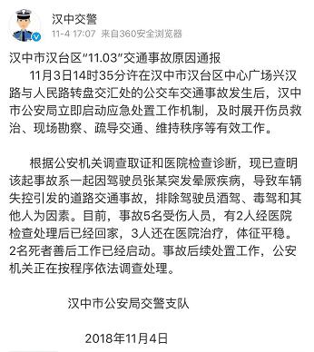 漢中交警部門4日下午就3日漢中市一公交車連撞多車致人員傷亡一事通報稱,漢中市漢臺區11月3日14時35分許在漢中市漢臺區中心廣場興漢路與人民路轉盤交匯處的公交車交通事故發生后,漢中市公安局立即啟動應急處置工作機制,及時展開傷員救治、現場勘察、疏導交通、維持秩序等有效工作。