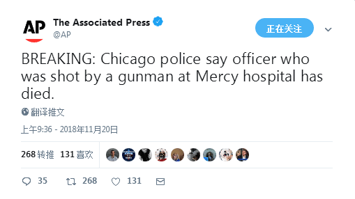 [環球網報道 記者 查希]據美聯社11月20日最新報道,芝加哥警方稱,被槍手擊中的警官已經死亡。