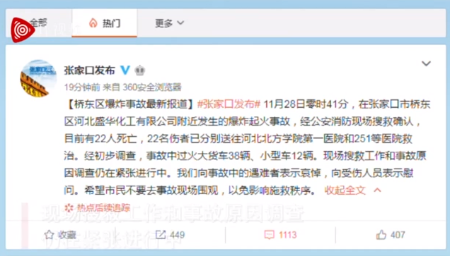 11月28日零時41分,在張家口市橋東區河北盛華化工有限公司附近發生的爆炸起火事故,經公安消防現場搜救確認,目前有22人死亡,22名傷者已分別送往河北北方學院第一醫院和251等醫院救治。