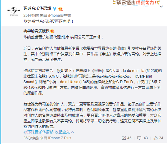 聲明稱:任何罔顧事實、肆意宣泄借機抹黑的言論不僅對創作人的名譽造成損害及構成誹謗,更會否定創作人對音樂的熱愛和尊重,要求大家立即刪除并停止造謠傳播,公司將采取一切必要行動,追究任何不實指控及維護簽約創作人的權益。