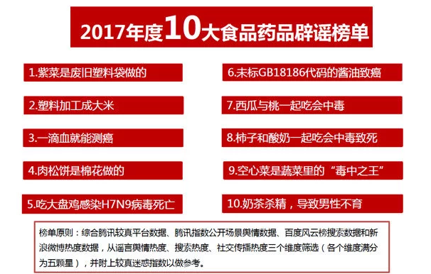 2018年3月1日,北京市網信辦指導首都互聯網協會新聞評議專業委員會召開2018年 度第二次會議,北京地區網站聯合辟謠平臺、騰訊較真平臺、百度和微博聯合發布《2017年度食品藥品辟謠分析報告》。報告綜合了騰訊較真平臺數據、騰訊指數公開場景輿情數據、百度風云榜搜索數據和新浪微博熱度數據,從輿情熱度、搜索熱度、社交傳播熱度三個維度篩選,選出2017年最熱門的10條食品藥品謠言。
