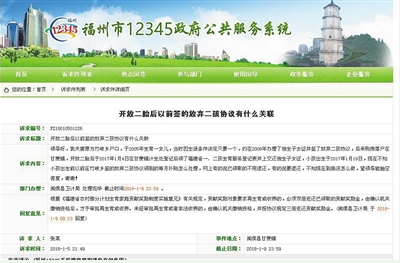 1月5日,福建閩侯縣居民張某在福州市12345政府公共服務系統發了一條咨詢消息,這條名為《開放二胎后以前簽的放棄二孩協議有什么關聯》的消息稱,2005年他和妻子生育一個女兒后,因生活條件所限決定只要一個,之后于2008年簽訂了一份自愿放棄二孩協議,此后每月獲得了獨生子女貢獻獎勵金。全面二孩政策出臺后,夫妻決定再要一個孩子,二人于2017年1月交還獨生子女證,并生育了第二個孩子。