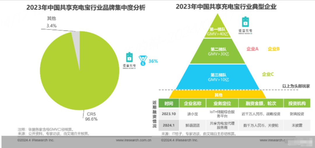 據艾瑞咨詢《2024年中國共享充電寶行業研究報告》,當前,國內共享充電寶行業集中度較高,前五大品牌占比96.6%。其中,怪獸充電的市占率最高,達到36%。從交易規模角度來看,怪獸充電GMV超過40億元,位列行業第一梯隊。