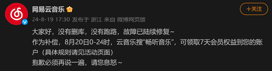 針對前述事故,網易云音樂為用戶提出補償方案,在8月20日0時至24時,用戶可以通過搜索“暢聽音樂”來領取7天的會員權益。以暢聽會員連續包月每月8元來估算,網易云音樂為2億月活用戶補償會員權益對應價值約4億元。