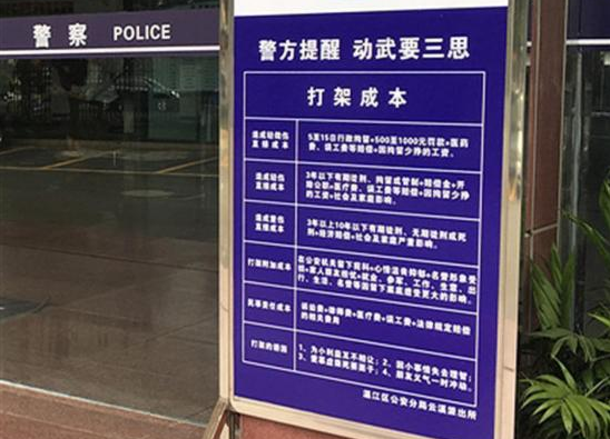 微博上流傳的圖片中,一塊警示牌上詳細列出了打架后的相應代價:“造成輕微傷直接成本,5至15日行政拘留+500至1000元罰款+醫藥費、誤工費等賠償+因拘留少掙的工資﹔造成輕傷直接成本,3年以下有期徒刑、拘留或管制+賠償金+開除公職+醫療費、誤工費等賠償+因拘留少掙的工資+社會及家庭影響﹔造成重傷直接成本,3年以上10年以下有期徒刑、無期徒刑或死刑+經濟賠償+社會及家庭嚴重影響……”