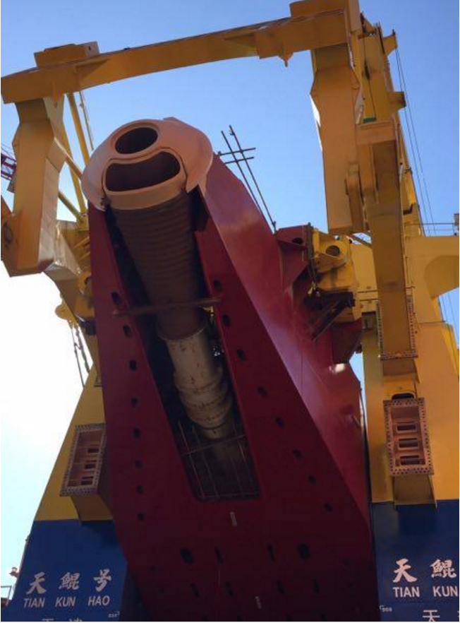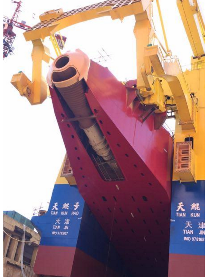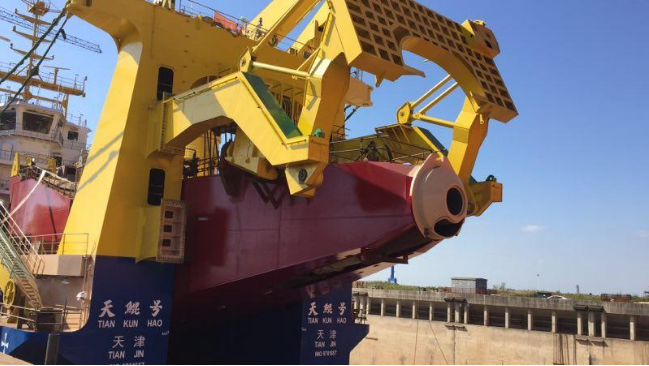 該船自2011年投產以來,在很多的重點項目建設中顯示出了巨大威力,特別是在挖掘巖石與長排距疏浚工程中發揮了極佳的經濟效益和極大的社會效益,外海島礁施工一戰成名。圖為即將下水的中國最強造島神器“天鯤號”